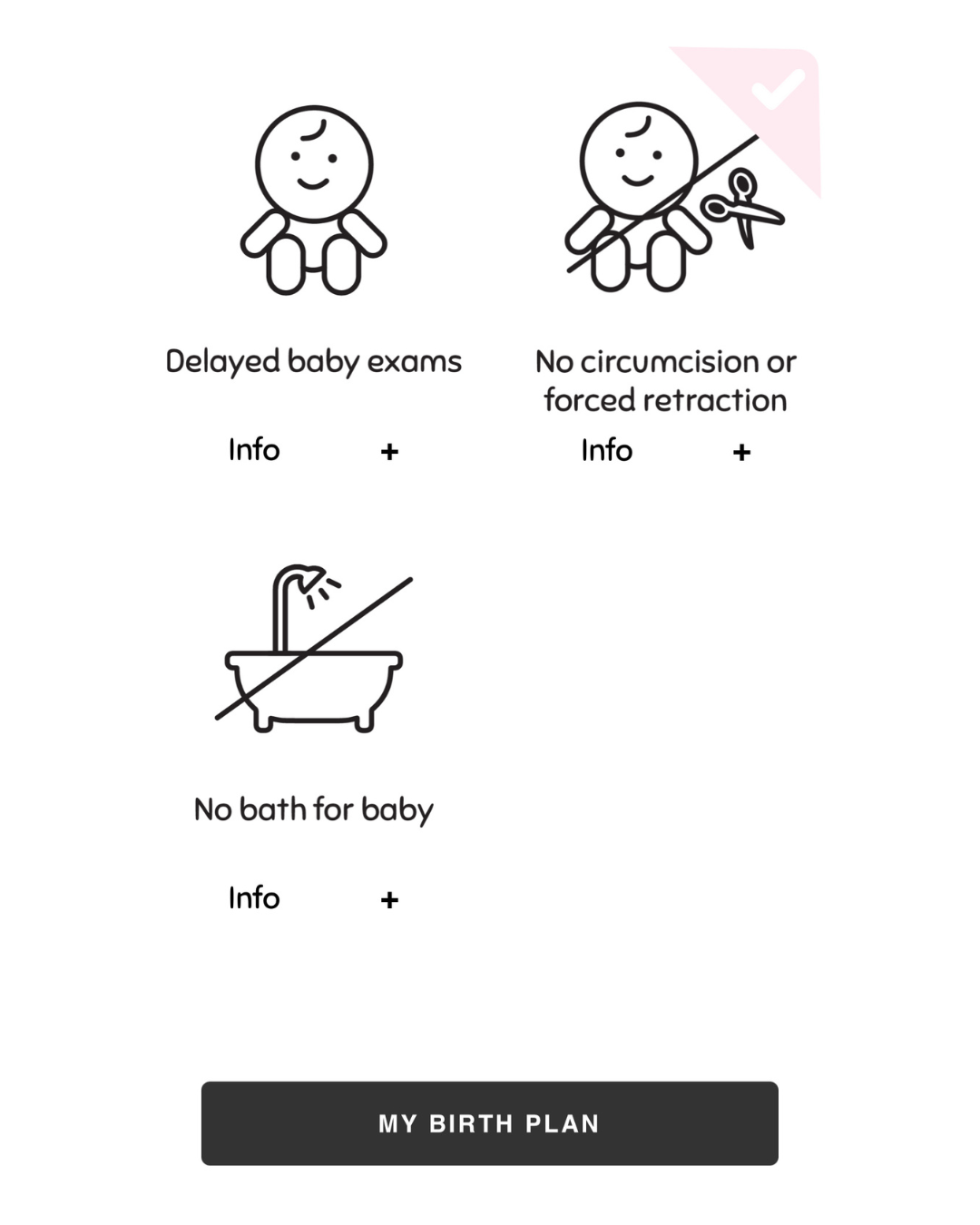 Simply scroll through each category – your birth vision, birthing environment, baby and placenta birth, newborn care and more – and tap the icons to checkmark your preferences. When you’re done, your plan is automatically organized into a clear, one-page PDF.